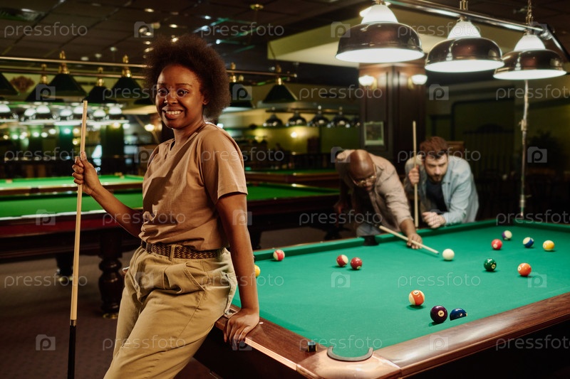 Молодая жизнерадостная женщина с бильярдной стрелкой