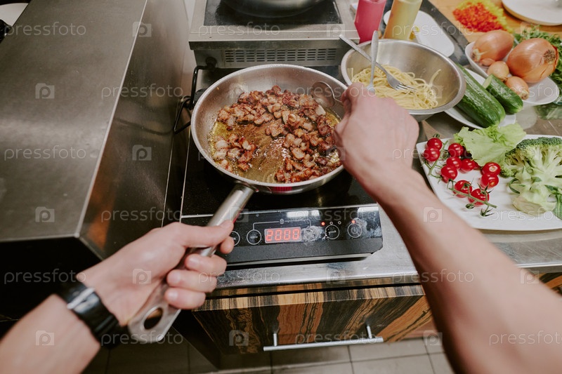 Снимок из точки зрения мужских рук, перемешивающих бекон в Пан