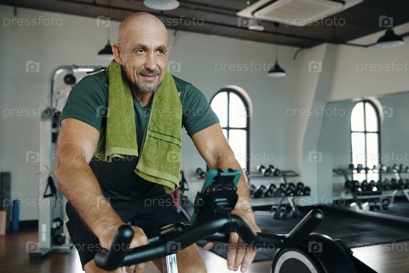Человек, тренирующийся на стационарном велосипеде в спортзале