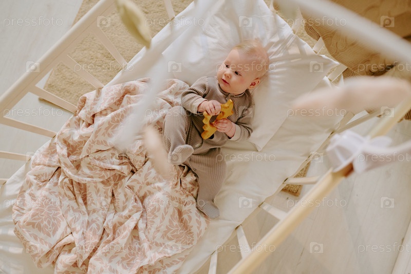 Малыш улыбается и играет в уютной колыбели