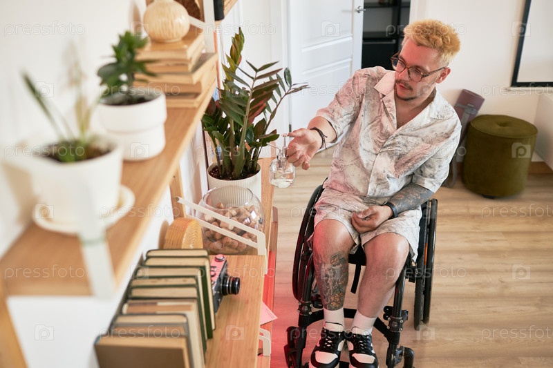 Человек в инвалидном кресле выбирает предмет с деревянной полки