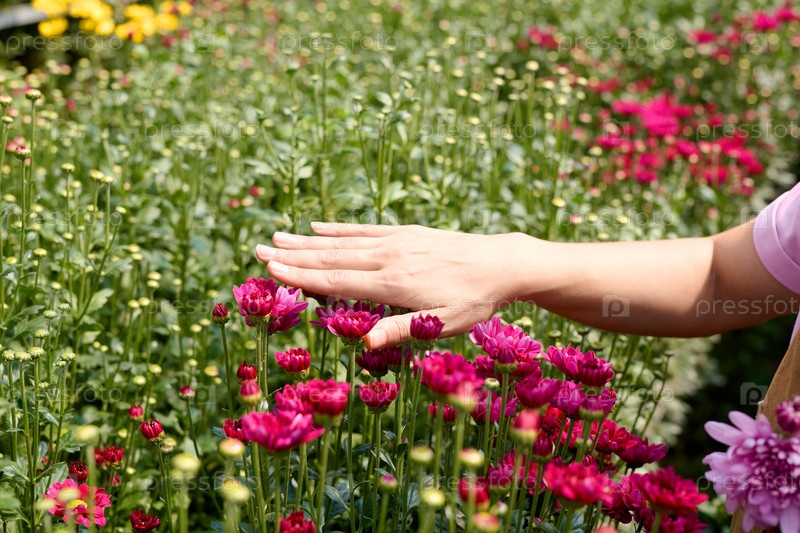 Рука, касающаяся цветов в солнечном свете