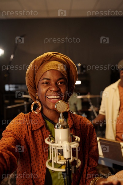 Улыбающаяся афроамериканская женщина использует микрофон в музыкальной студии