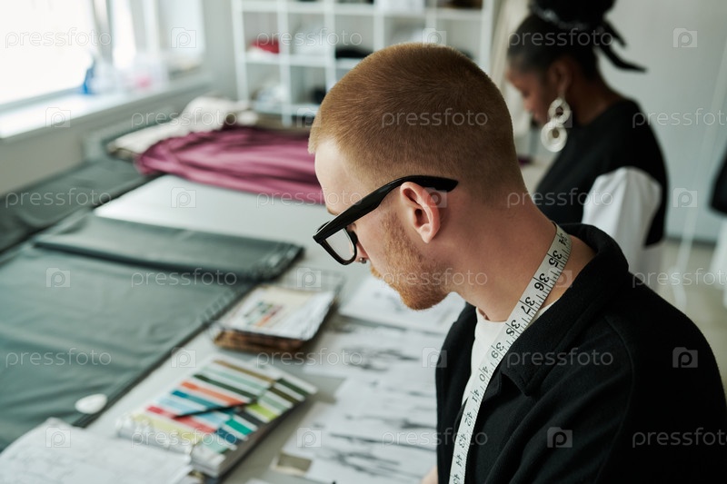 Модный дизайнер стоит на рабочем месте