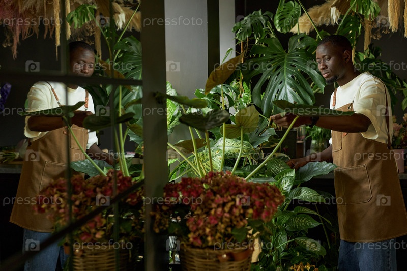 Молодой человек заботится о растениях в цветочном магазине с отражением