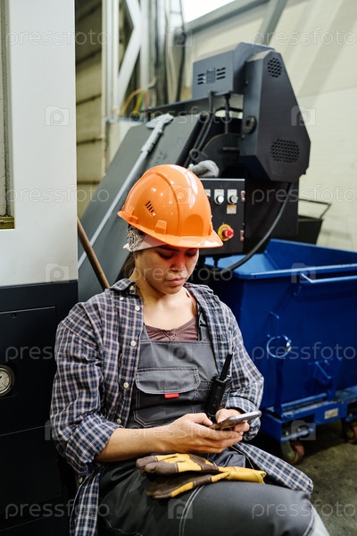 Ношение оранжевого шлема и униформы с использованием смартфона на фабрике