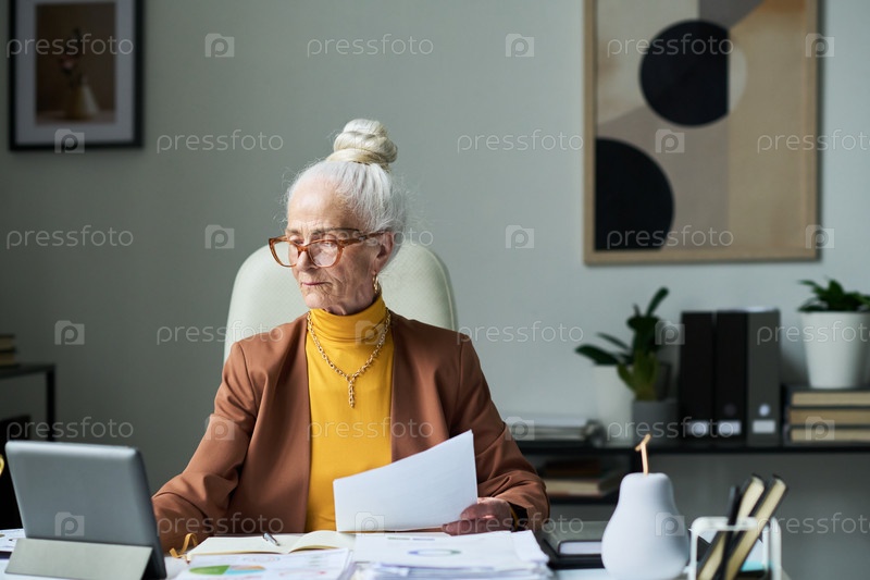 Пожилая женщина, держащая документы в современной офисной обстановке