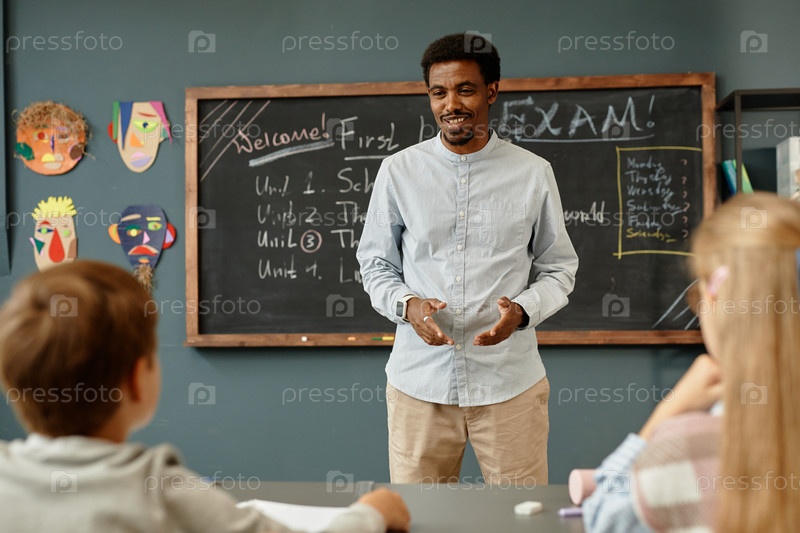 Улыбающийся чернокожий учит детей в классе с голубой стеной