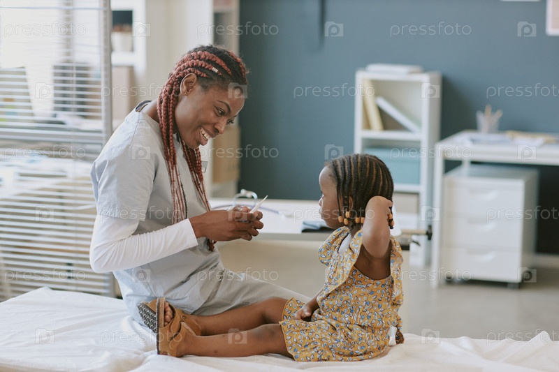 Улыбающаяся медсестра играет с ребенком в медицинском кабинете