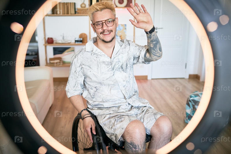 Улыбающийся мужчина, сидящий в инвалидном кресле и махающий камерой