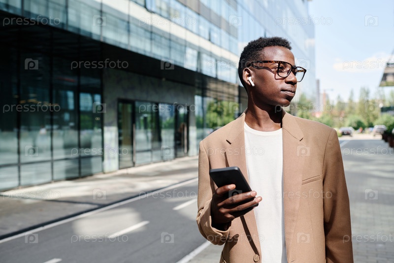 Молодой чернокожий мужчина слушает музыку по пути на работу