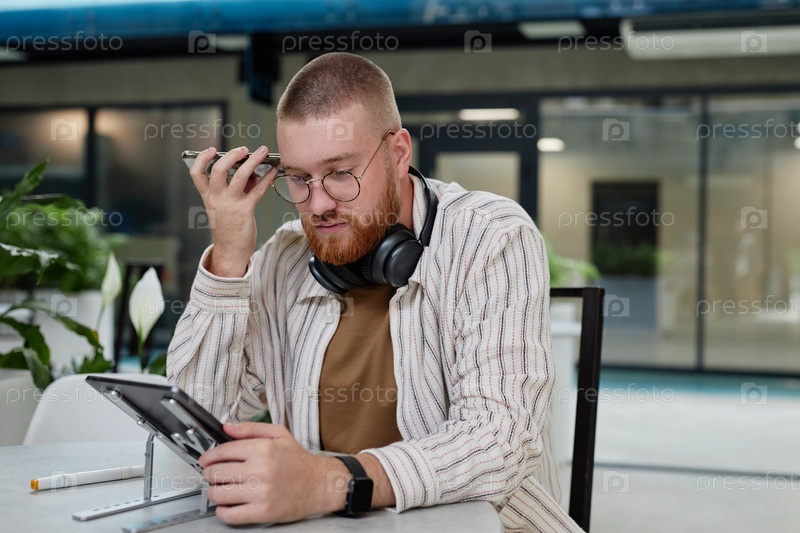 Бизнесмен, слушающий аудиосообщение по телефону Работает за столом кафе в бизнес-центре
