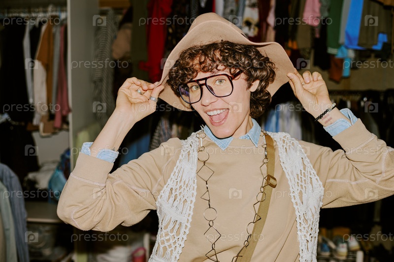 Улыбающийся молодой человек пробует стильную шляпу в шкафу