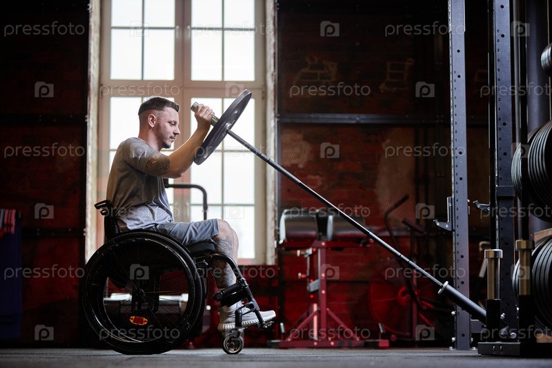 Человек, использующий инвалидное кресло в тренажерном зале Мужчина поднимает штангу