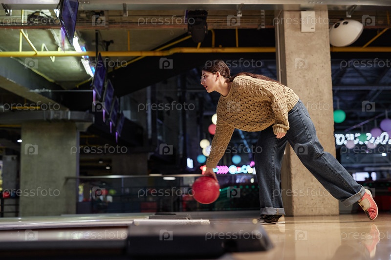 Женщина, играющая в боулинг на современной боулинговой аллее