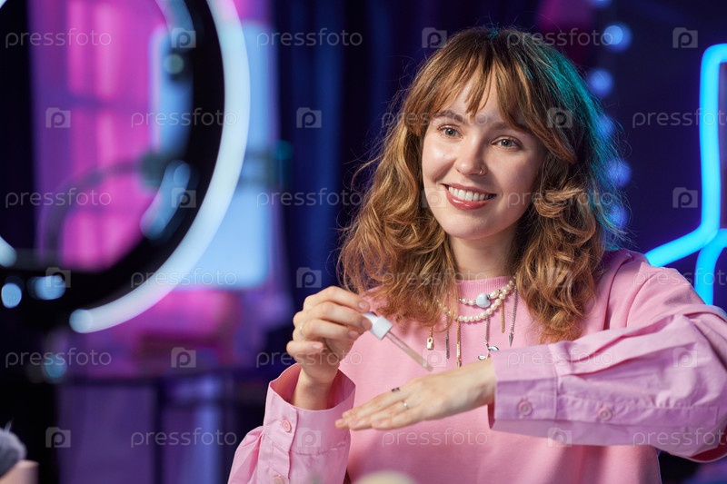 Девушка, которая просматривает продукты красоты в студии