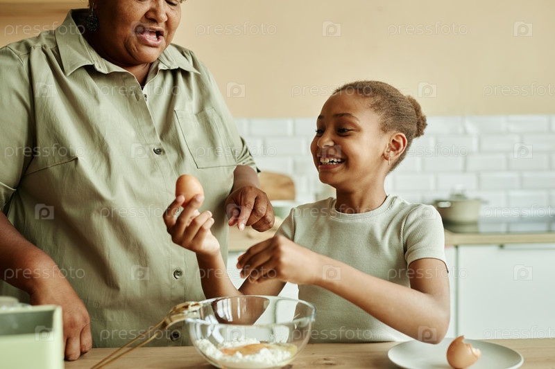 Бабушка учит ребенка с яйцами готовить блины на бежевой кухне