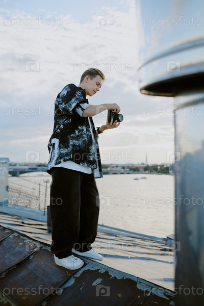 Человек позиционирует камеру для фотосессии на крыше