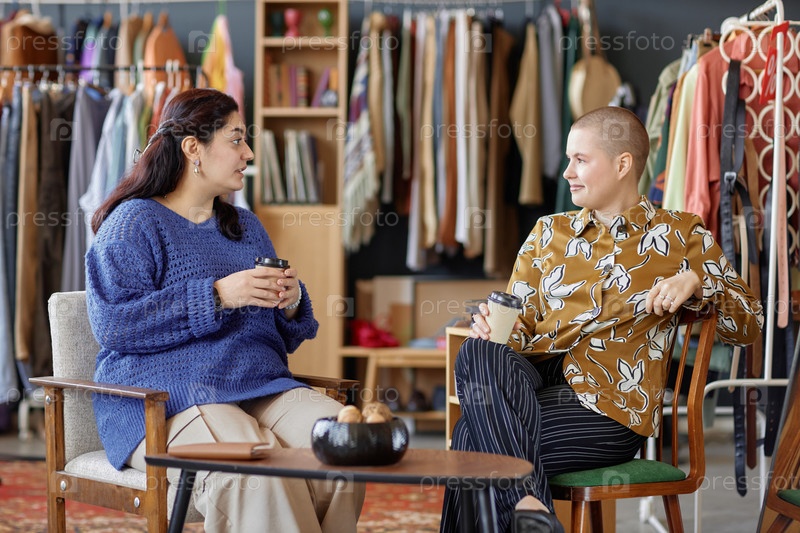 Две модные женщины беседуют, сидя за чаевым столом в магазине