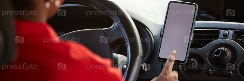 Водитель доставки, использующий смартфон в фургоне
