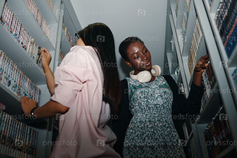 Девочки, ищущие книги в библиотеке