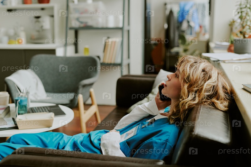 Боковой снимок медсестры, разговаривающей по телефону
