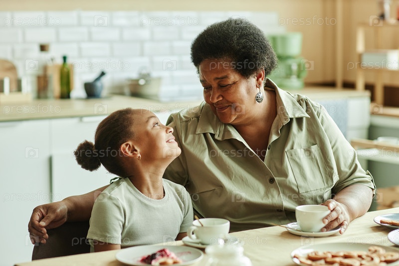 Счастливая бабушка смотрит с любовью на девушку, пьющую чай за кухонным столом