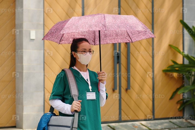 Медсестра, которая носит маску и держит открытый зонтик