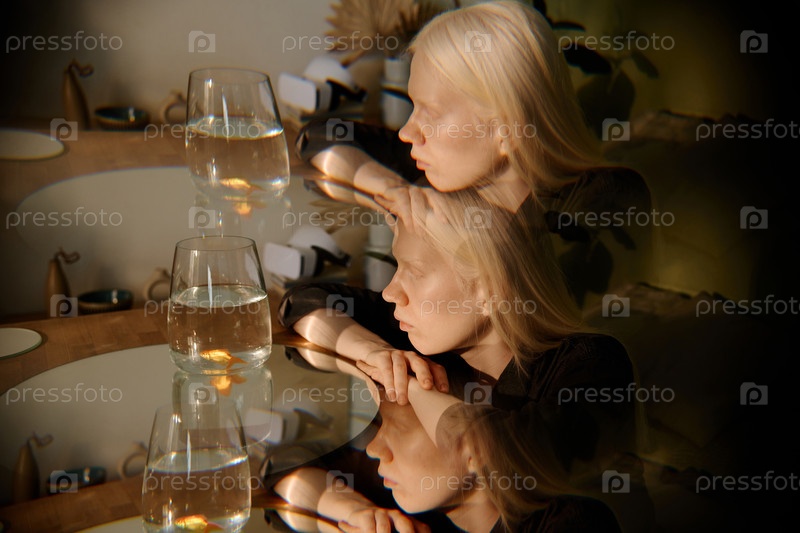 Белокожая девушка смотрит на золотую рыбку Многократное воздействие