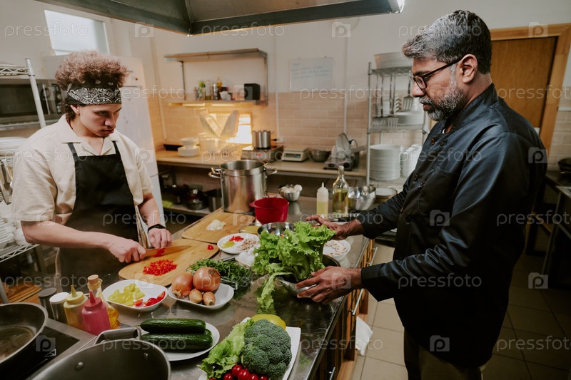 Шеф и повар готовят блюда для гостей