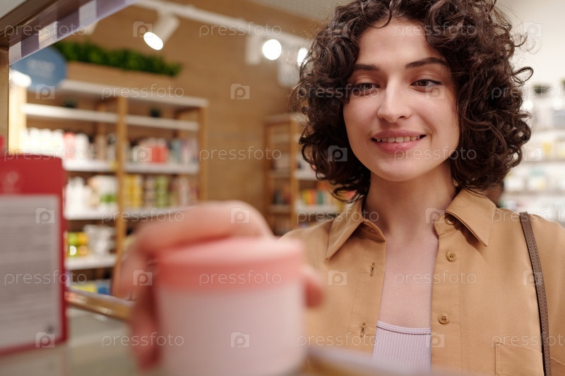 Девушка забирает банку крема с дисплея