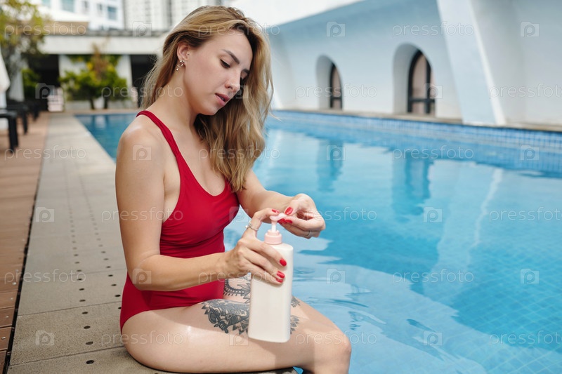 Нанесение солнцезащитного крема у бассейна в красном купальном костюме