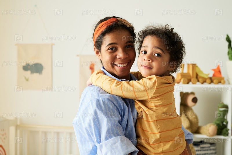 Улыбающаяся мать обнимает своего ребенка в уютной комнате