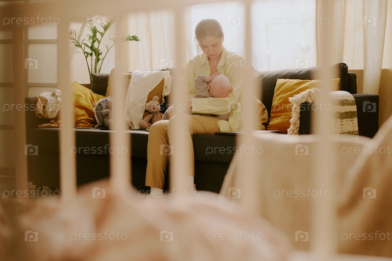 Заботливая мать колышет младенца в уютной обстановке гостиной