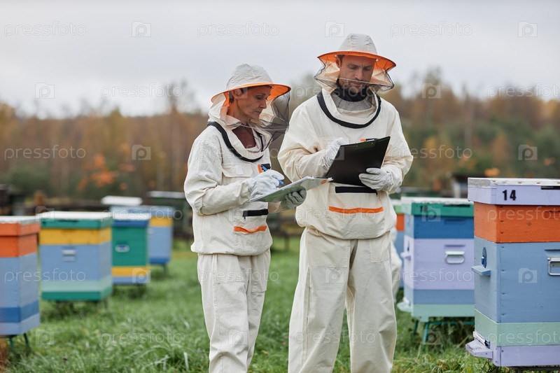 Пчеловоды в защитных костюмах пишут в тетрадях на ферме Apiary Farm