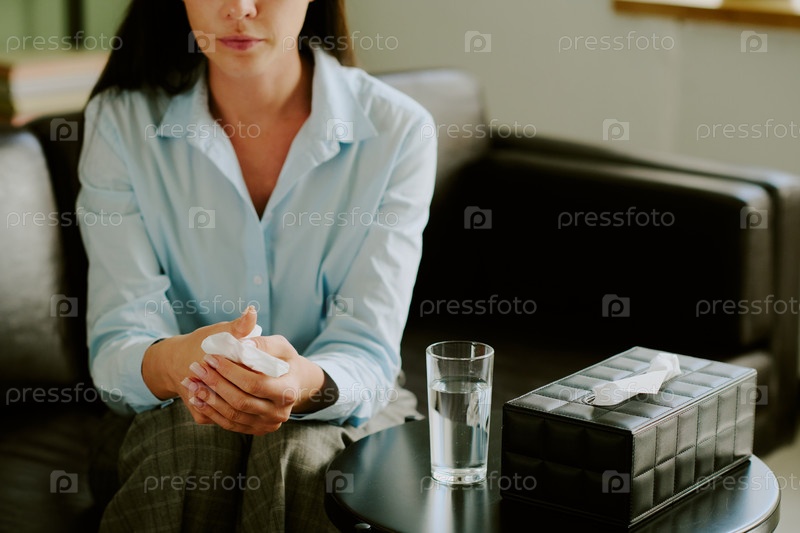 Женщина, сидящая на диване с тканями в руках Close-Up View Woman