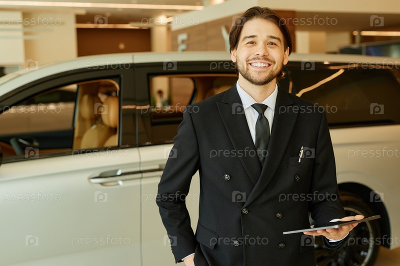 Портрет мужского автодилера в костюме в автомобильном дилерском центре