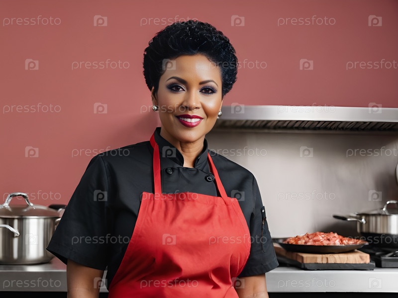 Ужин на профессиональной кухне в красном фартуке
