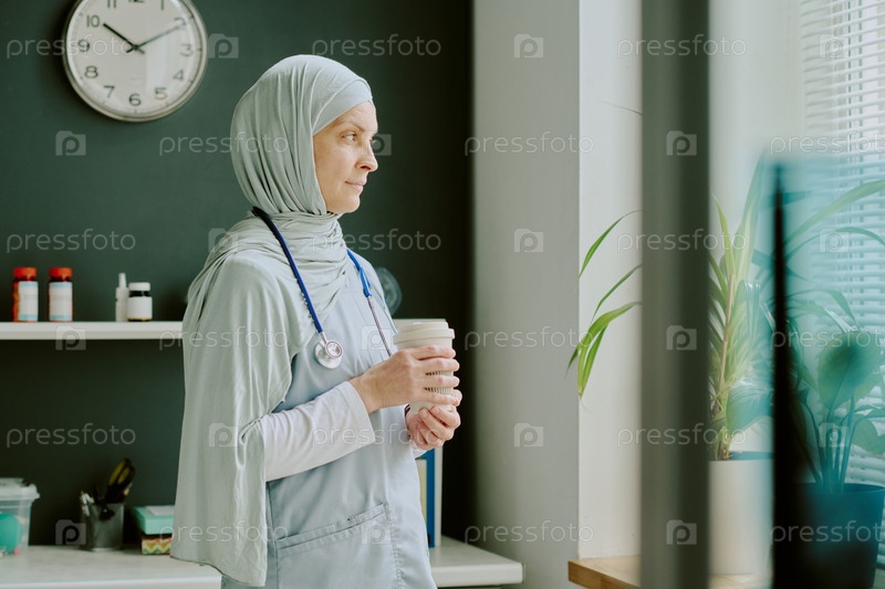 Медицинский профессионал, носящий хиджаб с кофейной чашкой