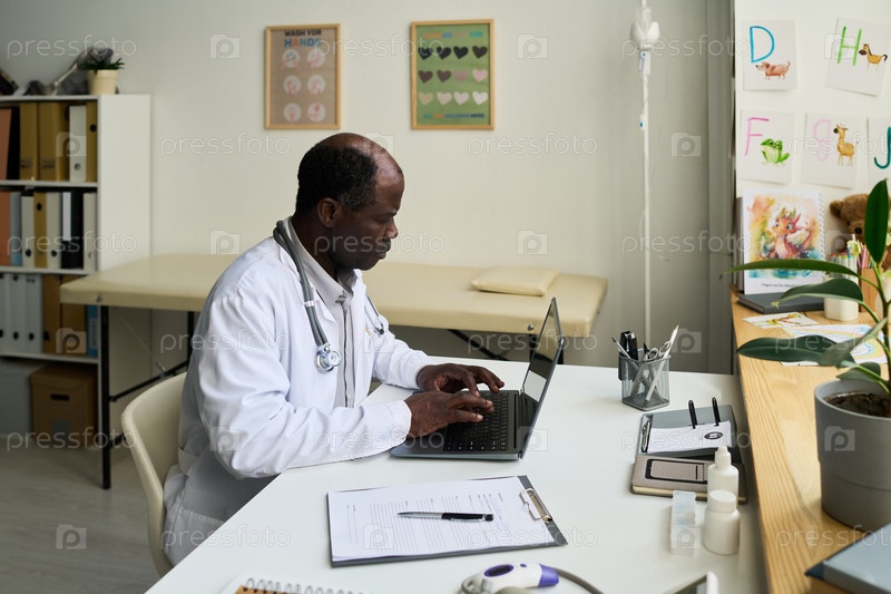 Американский врач, работающий в медицинском кабинете афроамериканец