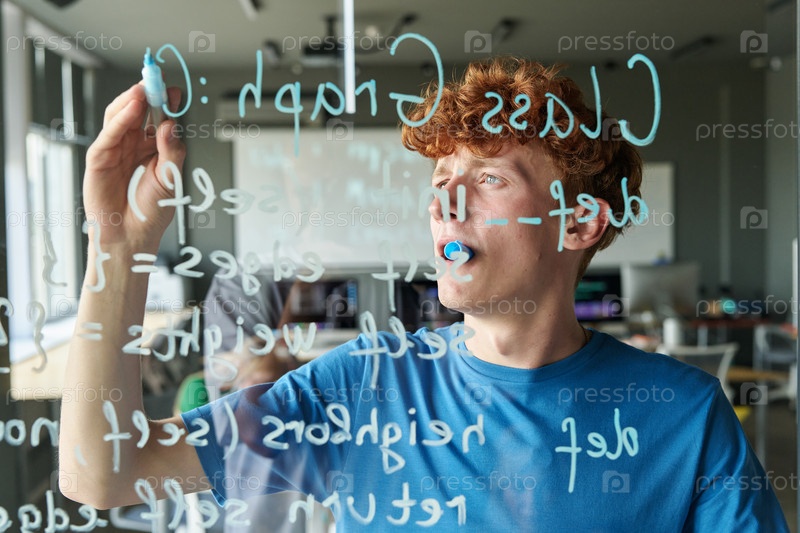 Студент пишет компьютерный код на стеклянной стене