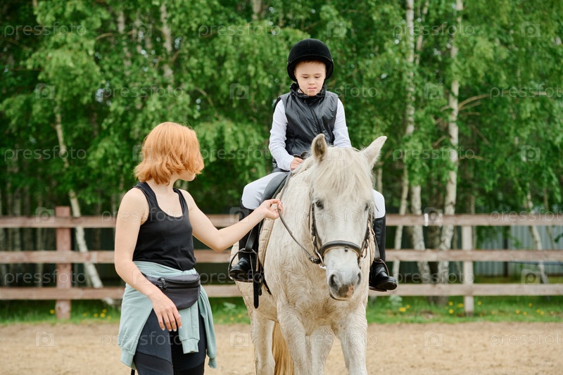 Тренер, помогающий маленькому ребенку ездить на лошади в открытом воздухе