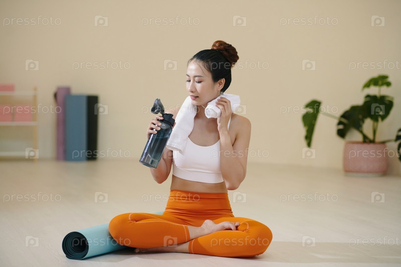 Отдыхающая после занятий йогой женщина, держащая бутылку с водой