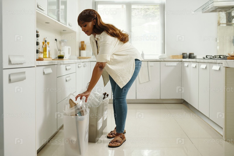 Женщина, убирающая кухню и выбрасывающая мусор
