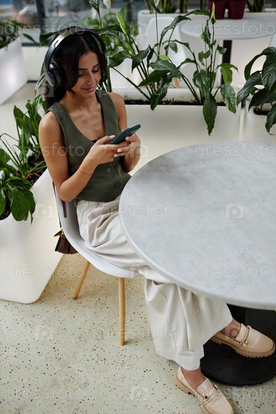 Женщина слушает музыку на наушниках, держит телефон за столом в кафе