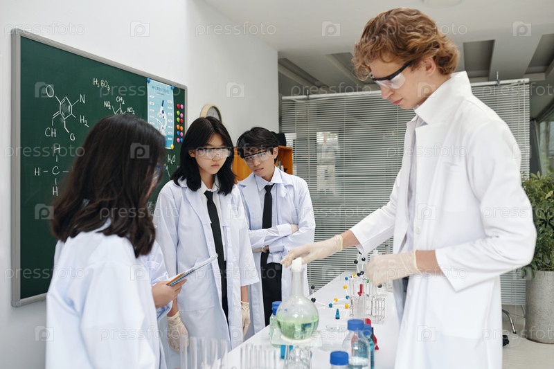 Исследовательская группа ученых, проводящих химические эксперименты