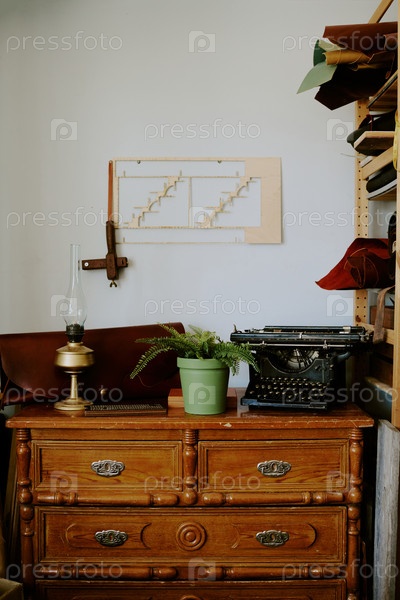 Антикварный гардероб с горшочкой для растений и античной пишущей машиной на вершине