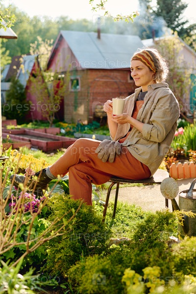 Женщина, выпивающая чашку чая в саду