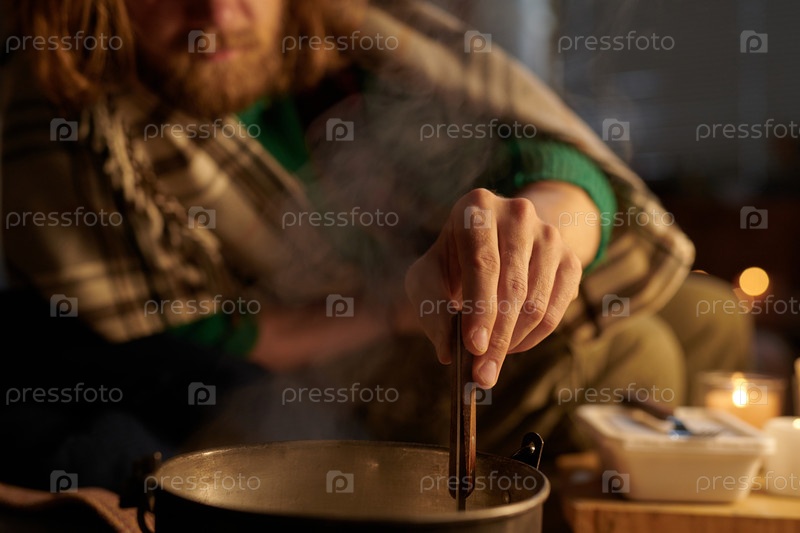 Перемешивание супа в горшке на холодный зимний вечер при свечах