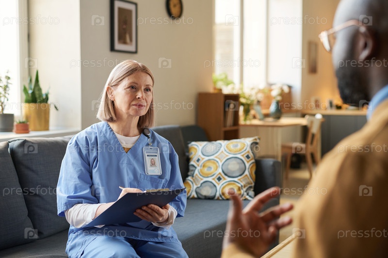 Женщина-врач, слушающая пациента дома